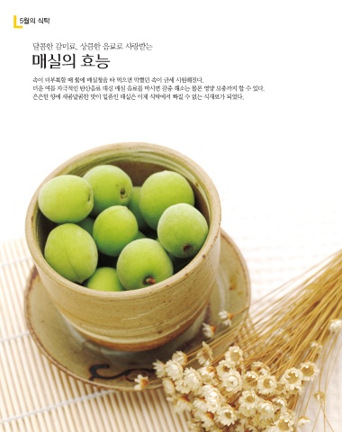 5월의 식탁 달콤한 감미료, 상큼한 음료로 사랑받는 매실의 효능 속이 더부룩할 때 물에 매실청을 타 먹으면 막혔던 속이 금세 시원해진다. 더운 여름 자극적인 탄산음료 대신 매실 음료를 마시면 갈증 해소는 물론 영양 보충까지 할 수 있다. 은은한 향에 새콤달콤한 맛이 일품인 매실은 이제 식탁에서 빠질 수 없는 식재료가 되었다. 54 may 2022
