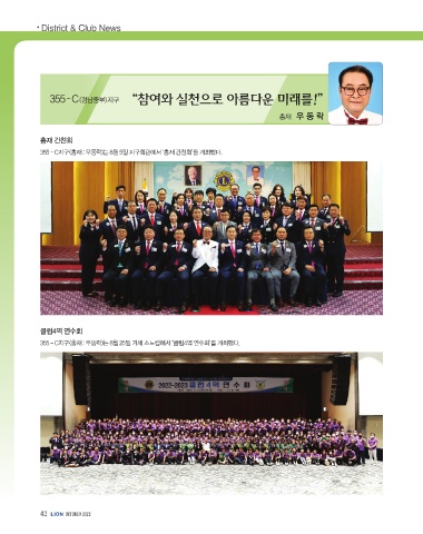 District & Club News “참여와 실천으로 아름다운 미래를!” 355–C(경남중부)지구 총재 우 동 락 총재 간친회 355–C지구 (총재 : 우동락)는 8월 5일 지구회관에서 ‘총재 간친회’를 개최했다. 클럽4역 연수회 355–C지구 (총재 : 우동락)는 8월 25일 거제 소노캄에서 ‘클럽4역 연수회’를 개최했다. 42 october 2022