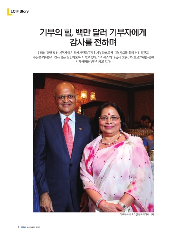 LCIF Story 기부의 힘, 백만 달러 기부자에게 감사를 전하며 우리의 백만 달러 기부자들은 국제재단(LCIF)에 기부함으로써 지역사회를 위해 헌신해왔고, 수많은 라이온이 같은 일을 실천하도록 이끌고 있다. 라이온스의 나눔은 교부금과 프로그램을 통해 지역사회를 변화시키고 있다. 아루나 아비 오즈월 전국제이사 내외 4 november 2025