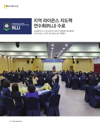 RLLI 수료 소감 지역 라이온스 지도력 연수회(RLLI) 수료 355복합지구는 11월 4일부터 5일까지 산청한방가족호텔에서 지역 라이온스 지도력 연수회(RLLI)를 개최했다. 22 deceMBeR 2025